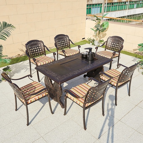 クラシックガーデンアルミロングテーブルチェアセット防水クッション屋外家具キャストティーダイニングテーブル6人用