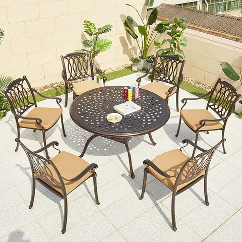 ヴィンテージガーデンアルミラウンドテーブルセットアームレスト屋外鋳造ダイニングルームセット6椅子テーブル家具高級